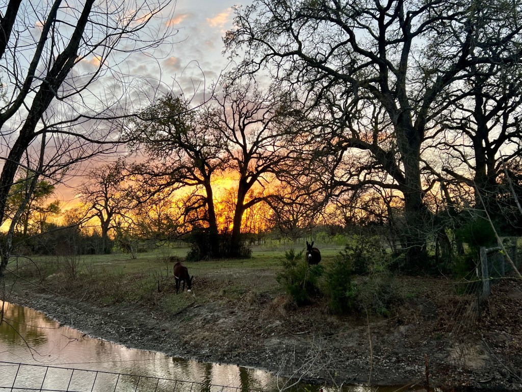 Fiona and Nellie graze in the back pasture at sunset.